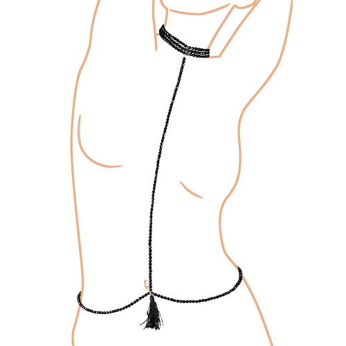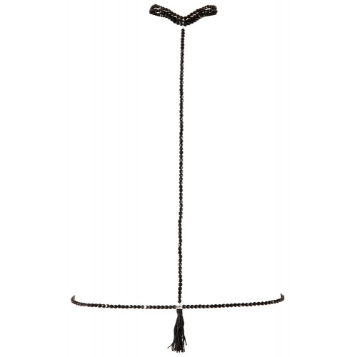 Карколомний аксесуар в чорному кольорі. Коротке намисто-нашийник з трьох рядів перлинних ниток, поєднане довгою перловою ланцюжком з перловим поясом. Виглядає контрастно і зухвало на голому тілі.
