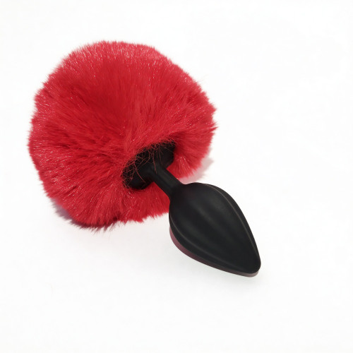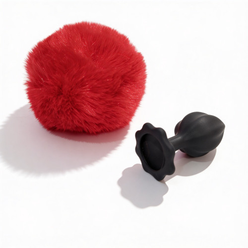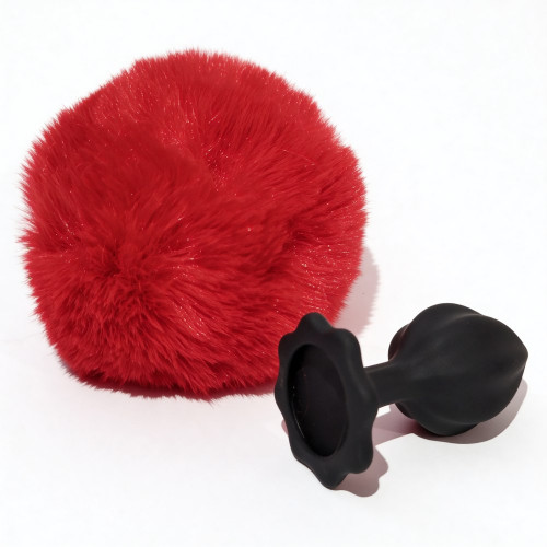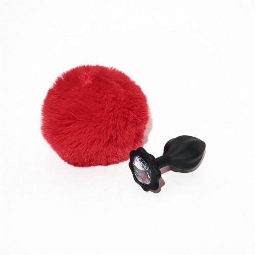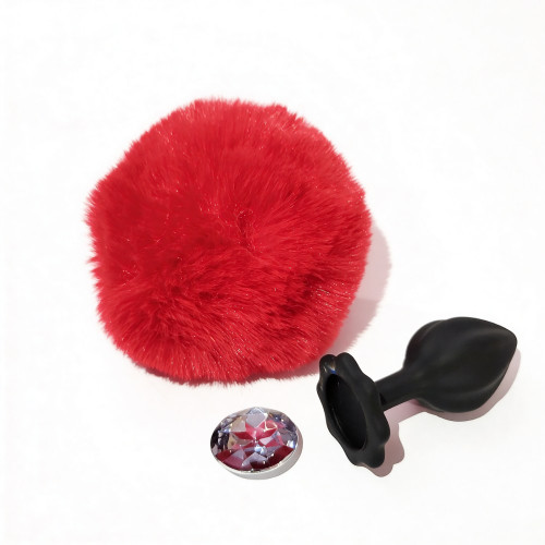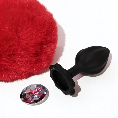 Анальная пробка рельефная ALUME, S, черная с красным пушком и сменным прозрачным камнем, 7 х 2,8 см