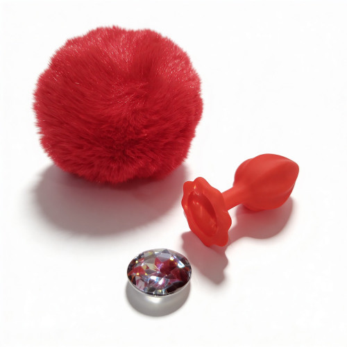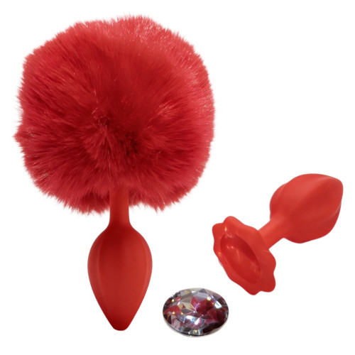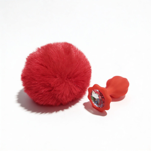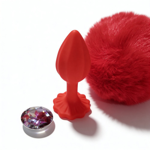 Анальная пробка рельефная ALUME, S, красная с красным пушком и сменным прозрачным камнем, 7 х 2,8 см