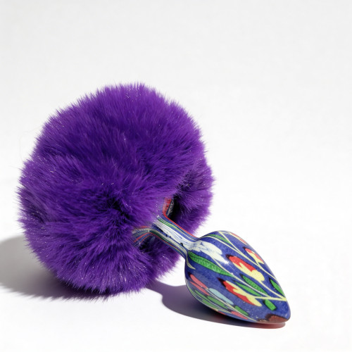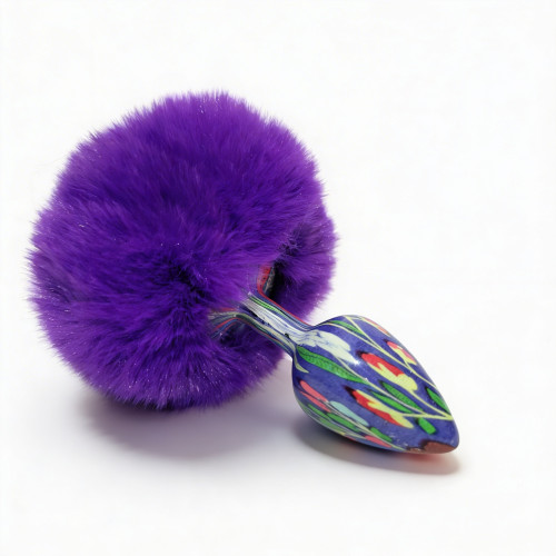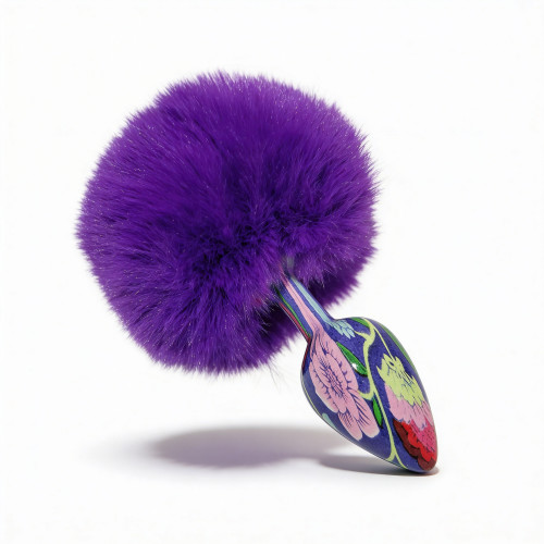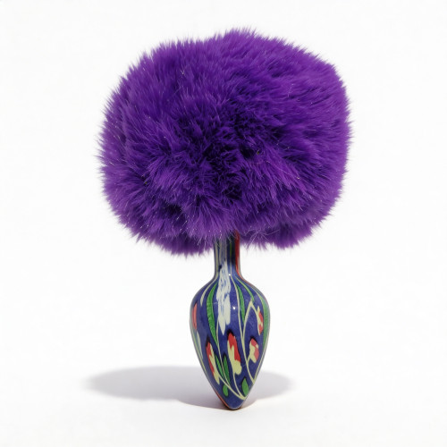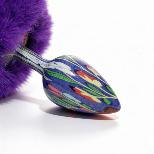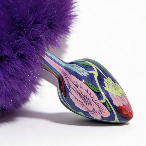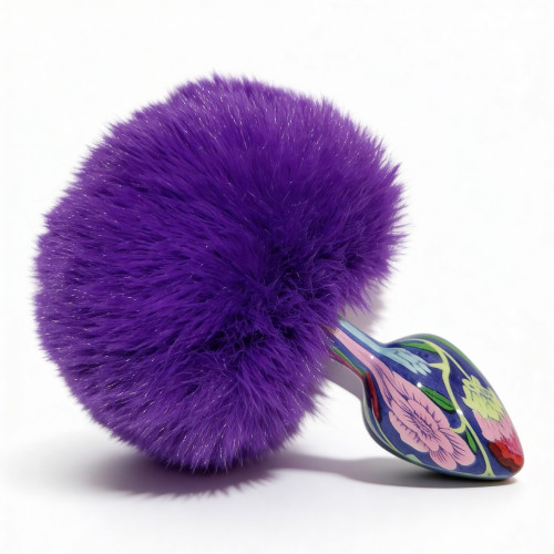 Анальная пробка небольшого размера с металлической вставной частью конической формы и заостренным кончиком. Корпус имеет глянцевую синюю поверхность с декоративным узором. Конструкция сужается к вершине для постепенного введения. Основа выполнена в виде объемного фиолетового пуха с легким блеском. Пух густой, фиолетовый, закреплен на металлическом стержне по центру. Общий вид сочетает гладкий металлический элемент и мягкую декоративную основу.