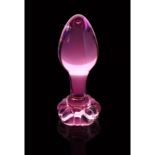 Розкішна анальна пробка рожевого кольору з високоякісного гартованого скла. Іграшка невеликого розміру, обтічної форми з гладкою безшовної поверхнею. Пробка володіє безпечним обмежувачем в формі ніжного квітки. Довжина - 8,9 см, діаметр - 3,2 см.
