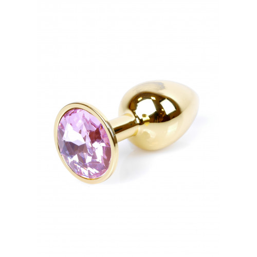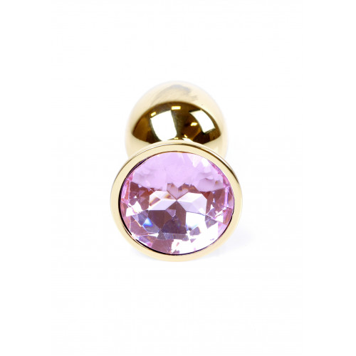 Золотиста анальна пробка з гладкою безшовною поверхнею. Створена з високоякісного металу, безпечного для здоров'я. Іграшка має зручний розмір і гладку конічну форму, яка забезпечує легке і безпечне користування. Для додаткових відчуттів, іграшку можна помістити в гарячу або холодну воду. Широка основа декорована сяючим блідо рожевим кристалом. Довжина - 7 см, діаметр - 2,7 см.