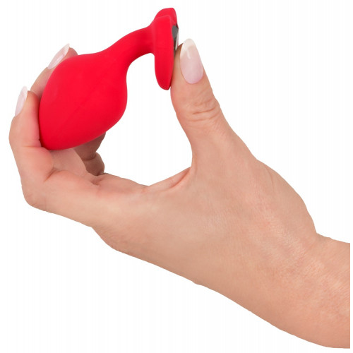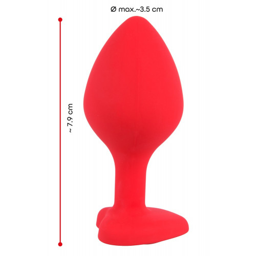 Анальна пробка яскравого червоного кольору. Створена з високоякісного силікону, приємного на дотик та безпечного для здоров'я. Іграшка має зручний розмір, гладку конічну форму і вузький кінчик, завдяки чому ідеально підійде як для початківців, так і для досвідчених користувачів. Основа-обмежувач має форму серця та декорована кристалом. Довжина - 7,9 см, діаметр (максимальний) - 3,5 см.