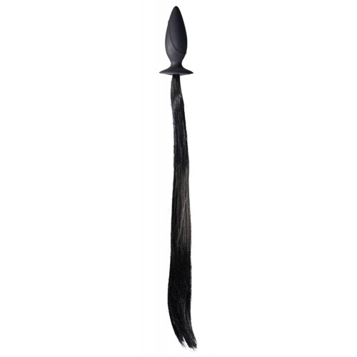 Черная анальная пробка с конским хвостом. Общая длина пробки 12,5 см, глубина вставки 11 см. Ø 2-4 см. Длина хвоста ок. 50 см. Материал: силикон, полиэстер.