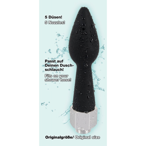 Насадка на змішувач для інтимного душа. Іграшка виконана у вигляді силіконової анальної пробки з завужені кінчиком і отворами. Підходить як для гігієнічних процедур, так і для водного масажу інтимних зон. Довжина - 16 см, діаметр - 3,5 см.