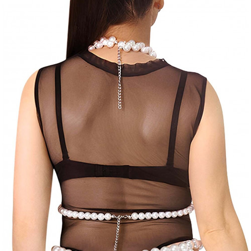 Жемчужный топ, который невозможно не заметить. Крупные бусины собраны в форму бра и красиво подчеркивают линию груди, создавая яркий, эффектный силуэт. Это не просто аксессуар — это акцент, который задаёт весь образ.