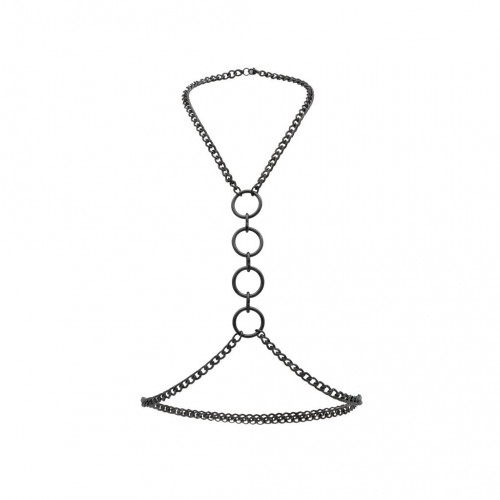 Конструкция мягко ложится по контуру, обрамляя зону декольте и подчеркивая талию. Центральные кольца усиливают драматичность образа и добавляют нотку доминирования. В движении цепи красиво перекликаются с телом, создавая игру света и притягательную динамику.