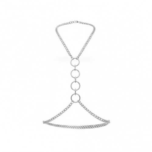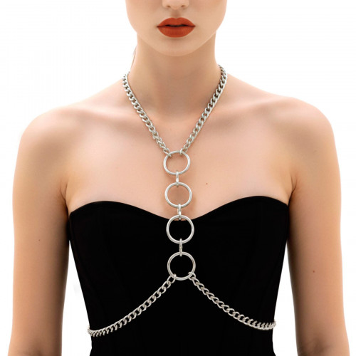 Конструкция мягко ложится по контуру, обрамляя зону декольте и подчеркивая талию. Центральные кольца усиливают драматичность образа и добавляют нотку доминирования. В движении цепи красиво перекликаются с телом, создавая игру света и притягательную динамику.