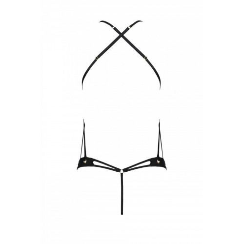 Еротичне та елегантне боді з екокожи з ремінцями та перфорацією tamaris body black l/xl — passion, майже повністю прикриває бюст лише злегка оголюючи контур груди. Тонкі ремінці візуально зменшують талію, а високі стринги вигідно окреслюють сідниці та додають пишності стегнам. Декор в вигляді перфорований зображення та золотавих люверс робить образ закінчений та не вимагає використання додаткових аксесуарів. Відкрита зона ластка дозволяє перейти до сексуальним ігор не знімаючи білизни. Регульовані бретелі перехрещуються на спині та забезпечують ідеальну посадку боді по постаті. Такий наряд підійде для бдсмсессий а в поєднанні з панчохами та туфлями на високих підборах додасть пристрасть в романтичний вечір.