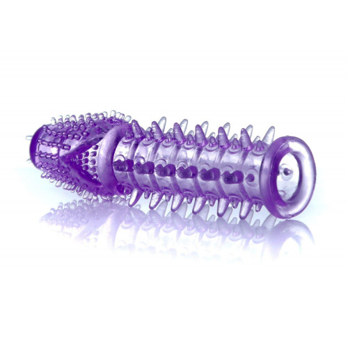 Закрита насадка на член. Виконана в фіолетовому кольорі з м'якого і еластичного гіпоалергенного матеріалу. Зовнішня текстура рельєфна у вигляді численних м'яких шипів для більш яскравих відчуттів та ефективної стимуляції. Завдяки еластичності матеріалу, аксесуар підійде на будь-який розмір статевого органу. Підходить для багаторазового використання.