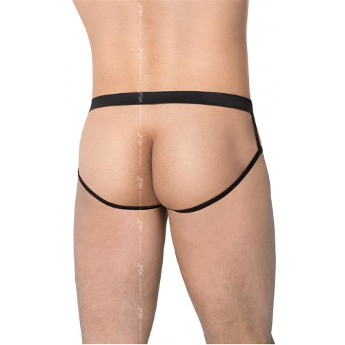 Сексуальні чоловічі стринги класичної форми з отвором для пеніса. Виконані в чорному кольорі з щільної тканини на широкій резинці на талії. Завдяки еластичності матеріалу, труси не пропонують дискомфорту у використанні.