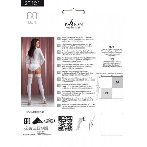 Елегантні панчохи passion st121 1/2 білі, на ажурною силіконовою гумці, з квітковим орнаментом та вертикальним швом з шовковистого та цупкого матеріалу вигідно підкреслюють стрункість ніжок. Мереживна підв'язка, з квітковим декором, приховує самоподдерживающуюnbsp гумку та візуально подовжує ніжку. Витончений дизайн панчоха з флористичний малюнками, в поєднанні з білим кольором, створює м'який еротичний образ, одночасно пристрасний та невинний. Панчохи надійно прилягають до шкірі, максимально комфортні та відмінно поєднуються з корсетами або мереживним білизною.