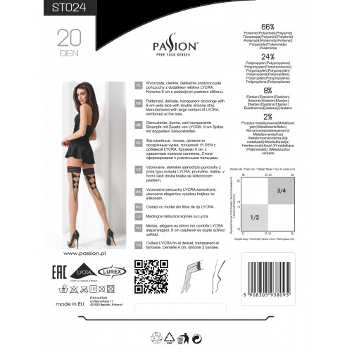В нашому магазині ви можете купити високі панчохи від європейського бренду passion. Цікавий дизайн моделі st024 nero доповнить ваш образ, зробивши його більш елегантним. Самоподдерживающаяся гумка шириною 9 см виконана в вигляді горизонтальних чергуються тонких світлих та темних смуг. Внутрішня частина резинки посилена двома силіконовими вставками, що дозволяє панчохи надійно триматися на ніжках та не збиратися в складки. Високі панчохи можна одягати самостійно, або комбінувати з поясом.
