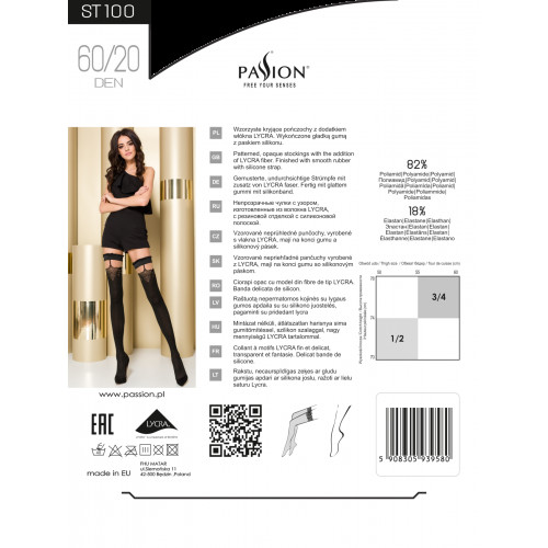 У нас на сайті ви можете купити щільні панчохи від популярною польської компанії passion. Модель st100 red виконана з чорного матового матеріалу щільністю 60 den з додаванням волокон lycra. Верхня частина панчоха прикрашена фантазійним візерунком, а між ним та гумкою є напівпрозора вставка щільністю 20 den. Панчохи посилені силіконовою стрічкою, яка дозволяє надійно зафіксувати їх на потрібної висоті стегна. Щільні панчохи цілковито не сповзають в процесі шкарпетки, відмінно сидять на ніжках та не вимагають придбання додаткових аксесуарів.