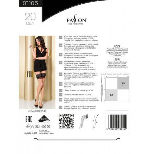 У нас на сайті ви можете купити сексуальні панчохи виробництва європейської компанії passion. Модель st105 grey - ваш вибір, якщо ви шукаєте панчохи відмінної якості з елегантним дизайном. Сексуальні панчохи не вимагають спеціального пояси, оскільки мають самопідтримуватися рєзніку з двома силіконовими вставками. Розкішне чорне мереживо з флористичним орнаментом, яким прикрашена гумка, щільно облягає стегна та підкреслює красоту ніжок. Висока зміст волокон lycra та посилений мисок гарантують міцність панчоха при щільності всього 20 den.