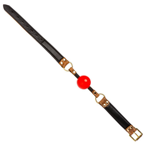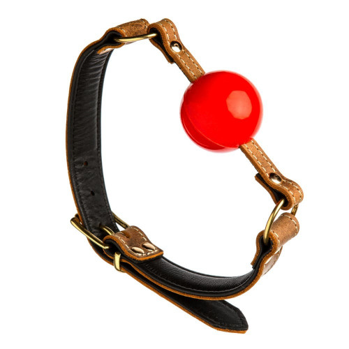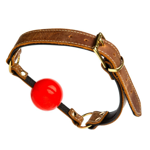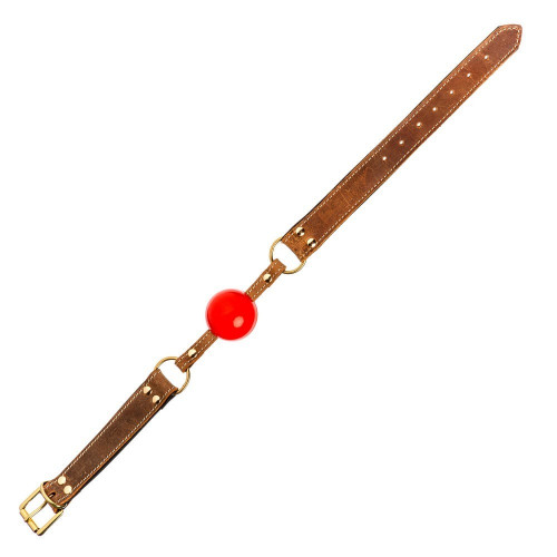 Кляп из коричневой итальянской кожи DS Fetish с красным шариком (Голландия)