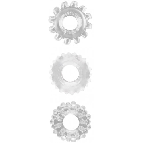 Набір з трьох ерекційних кілець прозорого кольору. Зроблені з еластичного термопластичного еластомеру, безпечного для здоров'я. Кільця маю різний рельєф на поверхні для додаткової стимуляції партнерки. Кожне з кілець легко одягається на пеніс, перешкоджає відтоку крові, ніж робить ерекцію більш сильної і тривалої. Діаметр - 1,6 см.