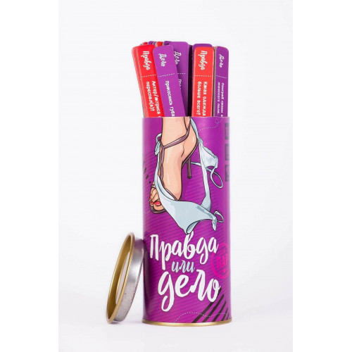Коротко про правила: ви по черги запитуєте один друга правда або справа . Якщо вибрали справа - тягніть стік та виконуйте завдання з його фіолетовою боку. Правда - вам необхідно відповісти на питання з червоної боку стіки. Не можна вибирати одне та теж завдання більш двох раз поспіль. Ви можете відмовитися від виконання справи або правди не більш двох раз за гру. Після третього відмови інший гравецьи призначає вам покаранняфантазируйте ) ) та, яке, зобов'язано бути виконано. В гру немає переможців, переможених - головне участь. Розслабтеся, будьте чесні та наполегливі, та ви отримаєте від ігри максимум задоволення :) в комплекті: 50 справ та 50 питань.