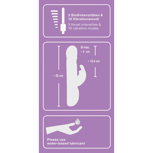 Реалістичний вібратор з кліторним відростком у вигляді кролика. Створено з м'якого гіпоалергенного силікону з шовковистою поверхню. Має гладку виражену голівку, прямий стовбур і складки. Оснащений 10 різними режимами роботи, якими легко керувати на вбудованому контролері. Довжина - 25 см, діаметр - 4 см.