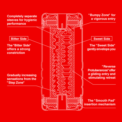 Унікальний чоловічий мастурбатор з двома отворами для проникнення: один отвір більш м'яке, інше - більш жорстке. Усередині мастурбатора знаходиться рукав з яскраво вираженим ребристим рельєфом, що забезпечує активну стимуляцію по всій довжині статевого члена. Усередині іграшка змазана лубрікантом.