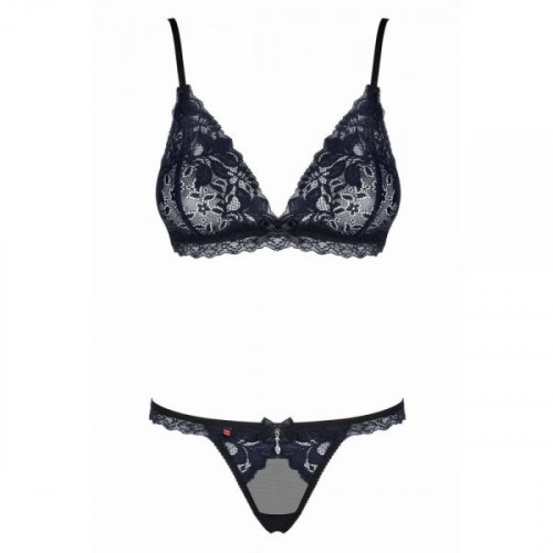 Польський бренд obsessive створює своє білізна надихаючись неймовірною красою, сексуальністю та ніжністю своїх покупців. Кожен комплект бренд створює з любов'ю та вкладає в нього то, що потрібно кожної з нас - відчувати себе впевненою та бажаною в будь-який ситуації. Хочете бути сексуальної та привабливою кожен день? тоді цей сексуальний комплект то, що вам необхідно. Поєднання прозорою сітки та квіткового мережива з темносиними вкрапленнями виглядає неймовірно привабливо. Бюстгальтер без кісточок з м'якою чашкою не доставить дискомфорту у врем'я носіння та при цьому добре підтримує груди. Чашечки декоровані ніжним мереживом, яке підкреслить витонченість та красоту зони декольте. Трусики з напівпрозорої сіточки та мережива декоровані елегантним окрасою.