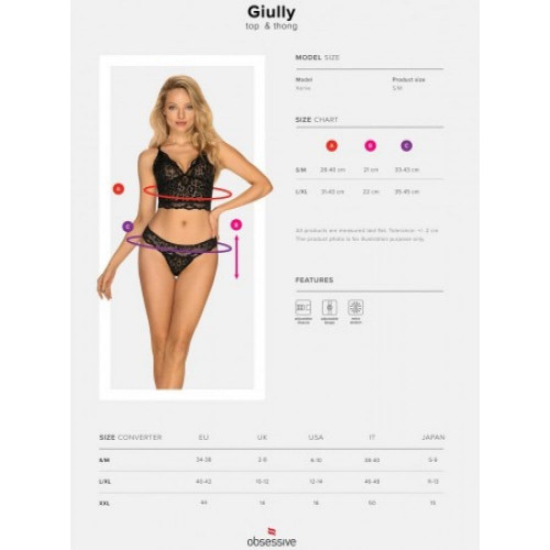 Эротический леопардовый комплект с кружевом Obsessive Giully, черный, L/XL Покажите партнеру свою натуру, станьте настоящей соблазнительной кошечкой с диким сексуальным аппетитом! Стильный дизайн удлиненного лифчика и соблазнительные трусики представлены в леопардовом принте, который добавляет общей картине смелости. Фасон интимного белья подчеркнет все ваши самые сексуальные изгибы, а романтичное кружево даст нотку воздушности. Регулируемые лямки пересекаются на спине, создавая замысловатый вид. Дополните этот сексуальный комплект эротическим халатиком для того чтобы добавить немного загадочности в свой образ. Купить сексуальный комплект вы можете в нашем онлайн-магазине с анонимной доставкой из секс-шопа по всем городам Украины. Характеристики: Материал - 94% полиамид, 6% эластан Цвет - черный Размер - L/XL