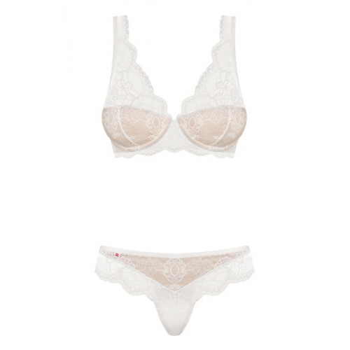 Ви хочете непомітно дати своєму парнетру зрозуміти, що хочете провести ніч, повну любовних утіх? надіньте ніжні білий комплект, котрий ідеально підкреслить все ваші вигини! в цей особливий вечір приготуйте своєму чоловікові таємничий сюрприз. Гарячі фантазії про пристрасному вечір не дадуть йому зосередитися весь день! комплект виготовлений з м'якою та еластичною тканини – тому він невагомий та комфортний. Особливості: елегантний комплект білого кольори чуттєвий, м'який бюстгальтер на кісточках мереживні бретельки з'єднані з бюстгальтером - ідеальна посадка регульовані бретельки та застібка на спині - зручність носіння чашки бюстгальтера з бежевою підкладкою - шикарно та елегантно мереживо нижче бюста - красиве прикраса сексуальні стринги з бежевого матеріалу спереду в комплект входять: бюстгальтер та стринги приємний на дотик та еластичний матеріал (90% поліамід, 10% еластан.