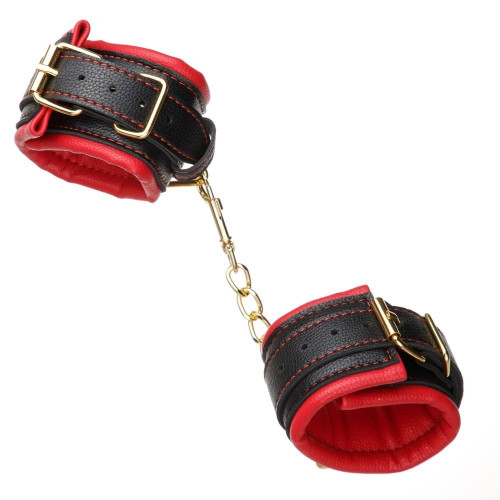 Получите полную власть над своим партнером с наручниками! Правильно и надежно зафиксировав партнера вы сможете насладиться разными видами удовольствия. Фиксаторы выполнены из качественного заменителя кожи красного и черного цвета. Скрепляют наручники крепкая, металлическая фурнитура и цепь, золотистого цвета. Цветовое сочетание невероятно контрастно и привлекательно. Наручники смотрятся очень эффектно. Купив дополнительно флоггер или кляп, вы сможете получить максимальное удовольствие от ролевой игры.