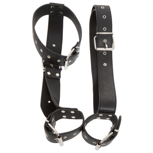 Міцна конструкція з чорної штучної шкіри: шийний обмежувач і поясний ремінь з'єднані надійно заклепками на спині. Наручники індивідуально кріпляться до заднього ременя один за іншим.