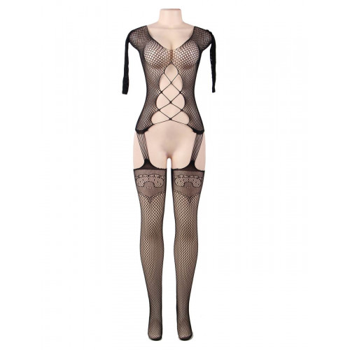 Бодистокинг сеткой с имитацией чулок, ажурными вставками и декоративной шнуровкой Star Night черный, XS-M