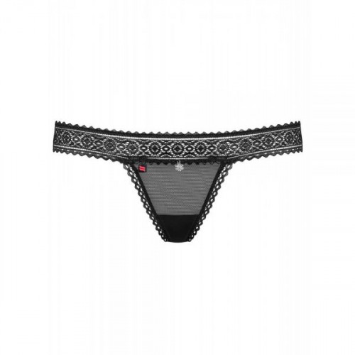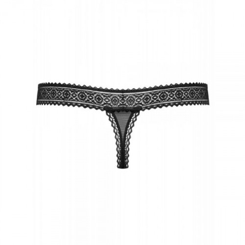 Сексуальні стринги мають широку мереживну гумку, привертає до собі погляд, немов магнітом. Красивий орнамент витончено опоясує стегна, сідниці та служить вишуканим декором для тіла. Лобок прикритий трикутником напівпрозорої тюлевою тканини з хвилястим візерунком по краю та прикрашений вгорі невеликим кулончиком з білим, виблискуючим стразом.
