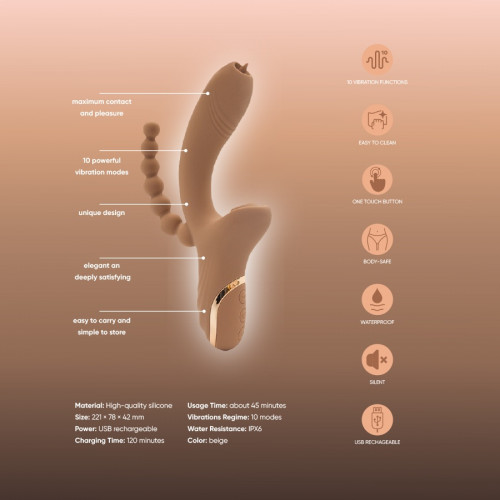Особенность модели — кролик-стимулятор, который воздействует на клитор, в то время как основная часть вибратора обеспечивает внутреннюю стимуляцию. Дополнительный анальный стимулятор открывает путь к новым комбинациям ощущений, создавая глубокое чувство полноты и наслаждения. Такое сочетание функций позволяет адаптировать использование под собственные предпочтения и экспериментировать с интенсивностью.