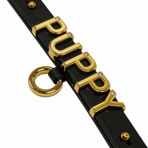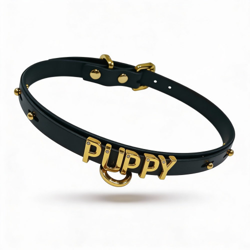 Чокер с надписью PUPPY от UPKO из итальянской кожи, чёрный с золотой фурнитурой
