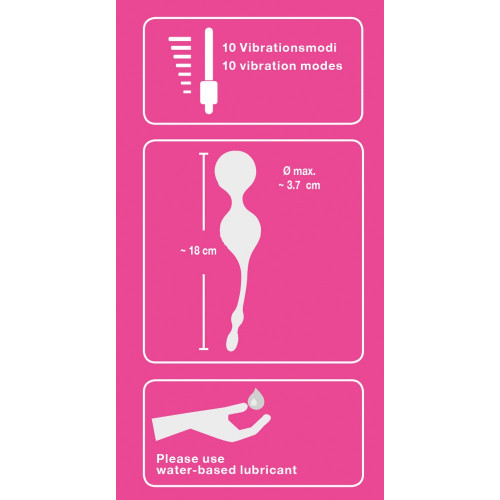 Перезаряджаються вагінальні кульки з 10 режимами потужної вібрації. Виготовлені з високоякісного бархатистого силікону з сріблястим декором. Регулярне використання кульок сприяє зміцненню м'язів тазового дна, гарантуючи обом партнерам більш яскравих відчуттів під час статевого акту. Довжина - 18 см, діаметр - 3,7 см.