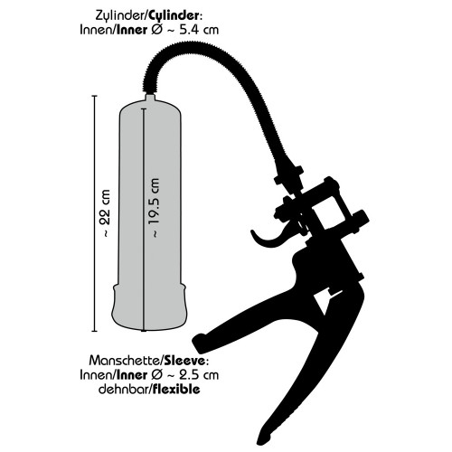 Мощная мужская вакуумная помпа черного цвета. Состоит из прозрачной пластиковой колбы с измерительной шкалой и специальным клапаном для регулировки давления, удобной ручки для откачки воздуха и гибкого соединительного шланга. Создана из высококачественного пластика и поливинилхлорида. Помпа существенно улучшает кровообращение, что положительно сказывается на качестве эрекции. При длительном использовании заметно увеличивает размер полового органа. Длина помпы - 22 см, диаметр - 5,4 см.