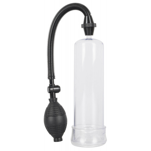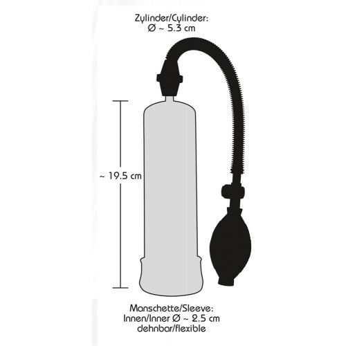 Мужская вакуумная помпа, состоит из прозрачной колбы, удобной груши с клапаном регулировки давления и гибкого шланга для откачки воздуха. Помпа существенно улучшает кровообращение, что положительно сказывается на качестве эрекции. При длительном использовании заметно увеличивает размер полового органа. Длина помпы - 19,5 см, диаметр - 5,3 см.