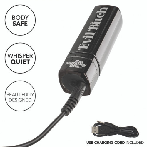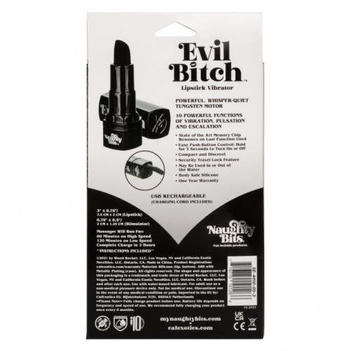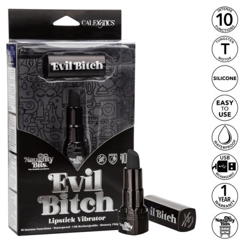 Осторожно, вибратор для губной помады Naughty Bits™ Evil Bitch™ — озорной и приятный. Дерзкий дизайн в виде черной помады, 10 мощных функций вибрации и бесшумный вольфрамовый двигатель созданы для того, чтобы радовать вас, куда бы вы ни отправились.