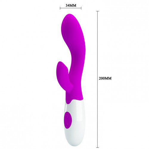 Силиконовый вибратор с дополнительным стимулятором клитора. Имеет 30-плавных вибраций. Цвет фиолетовый. Размеры: длина: 20 см, диаметр: 3,4 см. Питание: батарейки 2xAAA - нет в комплекте.