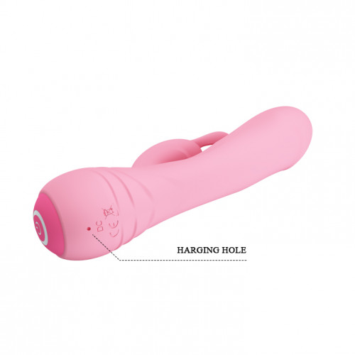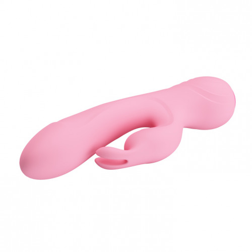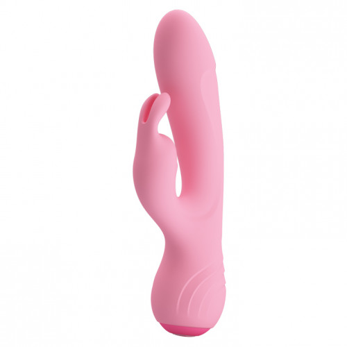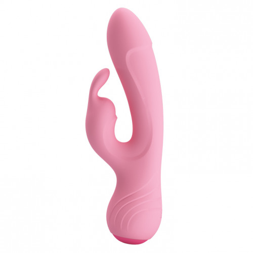 Вибратор нежно-розового цвета из высококачественного силикона с бархатистой поверхностью. Имеет плавную форму со стимулирующим рельефом на поверхности и загнутую головку для прямой стимуляции точки "G", а также клиторный отросток в виде кролика. Оснащен 12 режимами вибрации, которыми легко управлять при помощи кнопки в основании. Длина - 17,9 см, диаметр - 3,5 см.