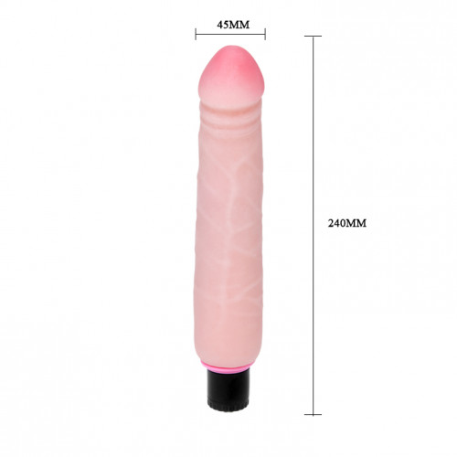Реалистичный вибратор телесного цвета. Имеет гладкую головку, прямой ствол и набухшие венки на поверхности. Игрушка сделана из мягкого гипоаллергенного материала, приятного на ощупь. Обладает мультискоростной вибрацией, которая регулируется в основании игрушки. Длина-24 см.