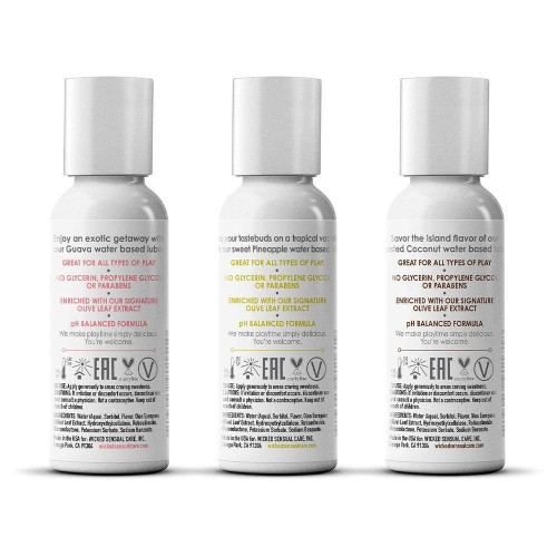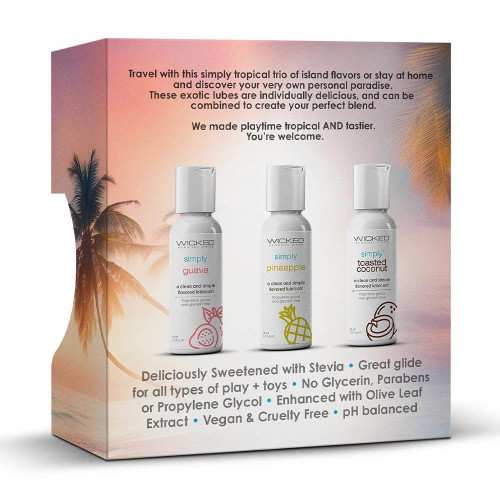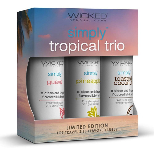 Набор лубрикантов Wicked Simply Tropical Trio – это идеальный выбор для тех, кто хочет добавить экзотические нотки в свою интимную игру. Этот ограниченный выпуск включает три вкусных лубриканта на водной основе с ароматами гуавы, ананаса и кокоса.