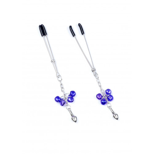 Зажимы для сосков с красивыми подвесками синего цвета. Сила сжатия регулируется с помощью ползунков на зажимах. На концах есть мягкие накладки для безопасного использования во время интимных игр.